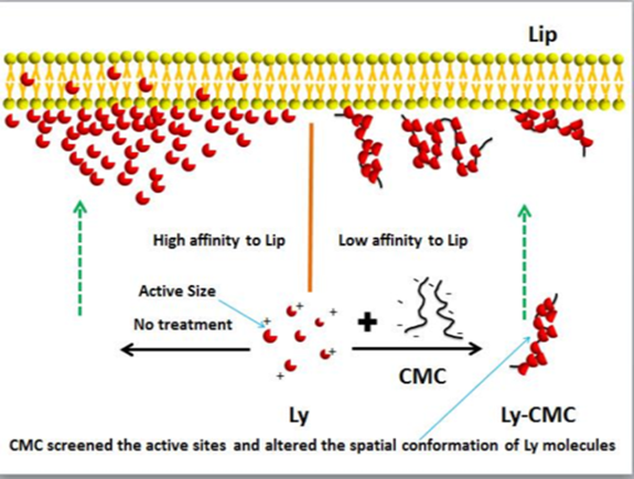 该论文主要研究内容是:溶菌酶为一种重要的天然食品防腐剂,但在食品应用存在稳定性差的问题,其主要原因可能为溶菌酶与其他高分子物质产生静电相互作用而抑制活性,但具体机理尚不清楚。该试验利用羧甲基纤维素与溶菌酶相互作用,考察其对溶菌酶生物活性的影响。溶菌酶抑菌重要的机制是其与微生物膜的亲和特性,该试验以单分子层脂质体膜作为生物膜模型,分析在羧甲基纤维素存在的条件下,溶菌酶与脂膜的亲和特性。研究结果表明,羧甲基纤维素是通过掩盖溶菌酶与膜的结合位点,改变酶的空间结构以及中和酶表面的正电荷而降低酶活。该研究在理论上解释了溶菌酶在食品中活力降低的关键机制。