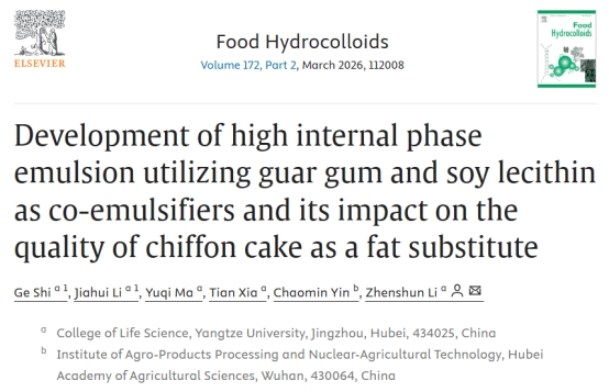 近日,我院食品高分子团队在食品领域Top期刊《Food Hydrocolloids》(IF=12.4,中科院一区)上发表了题为“Development of high internal phase emulsion utilizing guar gum and soy lecithin as co-emulsifiers and its impact on the quality of chiffon cake as a fat substitute”的学术论文。团队负责人李真顺教授为论文通讯作者,论文第一作者为食品科学与工程专业2023级硕士研究生史歌,长江大学生命科学学院为第一作者和通讯作者单位。