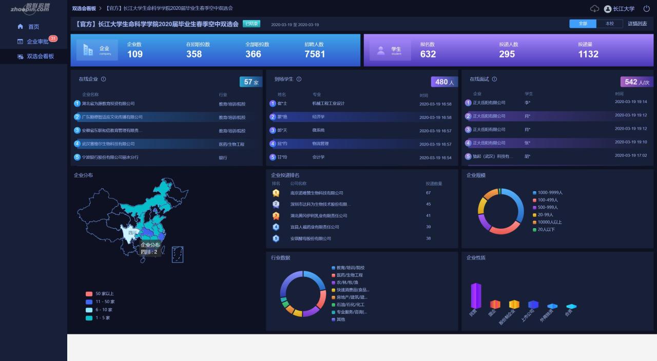 本次双选会共有163家单位报名,经过我院认真筛选审核通过的有109家,共提供岗位数366个,招聘人数达7581人,今日在线企业57家。涉及单位包括来自北京、广东、上海、浙江、武汉、宜昌、荆门、荆州等多个地区,提供包含研发工程师、生产技术员、检验员、辅导老师、销售等多种岗位。参与本次双选会的学生不仅有我院学生,还有本校其他学院和其他高校的学生,共报名632人,投递简历295人,投递简历量1132份,其中本校学生报名人数278人,投递简历量893份,今日到场学生480人,在线面试542人次。