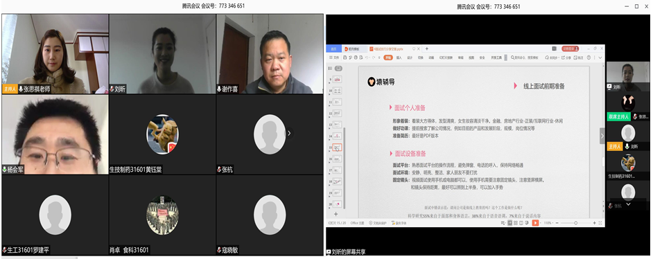 (通讯员 张思祺)在今年就业形势更加严峻以及疫情期间面试方式发生改变的情况下,为了帮助同学们适应新的变化,提高面试技巧,克服就业难关,我院于3月4日下午15时通过腾讯会议开展了毕业生就业指导培训之网络面试技巧,本次培训邀请到猿辅导武汉分公司招聘主管刘昕作为主讲人,我院16级辅导员张思祺老师为主持人,同时还有学院党委副书记谢作喜老师和学校就业指导中心杨会军老师参与到本次培训并给予指导,培训对象主要为我院毕业生以及我校其他学院毕业生,参与人数达200人左右。