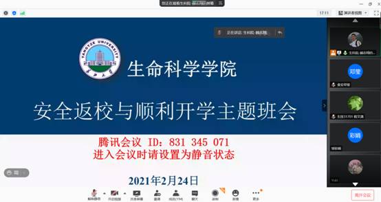 (通讯员 班元元) 为认真落实省教育厅和各校区属地社区关于校园疫情防控的总体要求,切实做好2021年春季学期开学的各项工作。按照学校通知要求,生命科学学院于2月22日-24日分年级组织全体本科生和研究生召开了线上“安全返校与顺利开学”主题班会,引导学生树牢防控意识。