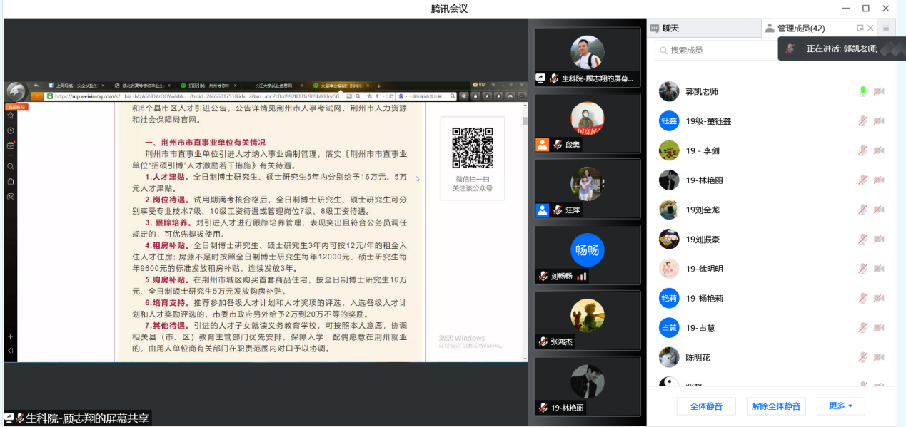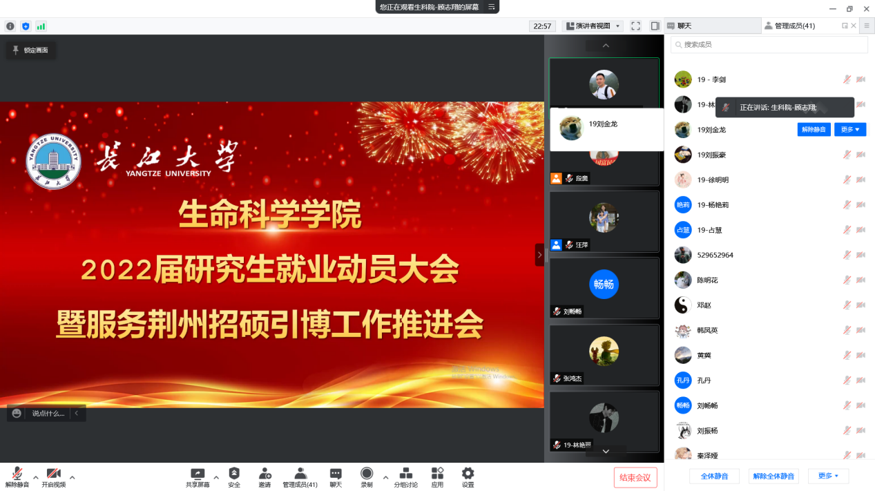(通讯员 顾志翔 段奥)为贯彻落实长江大学服务荆州招硕引博工作推进会相关精神,进一步优化久久久久久国产精品2022届研究生的就业服务及管理工作,促进高质量就业氛围的形成。我院于2022年2月24日下午顺利召开2022届研究生就业动员暨服务荆州招硕引博工作推进会议。根据疫情防控政策要求,本次会议采用腾讯会议方式线上召开。会议由党委副书记汪萍主持,研究生辅导员顾志翔,就业专干郭凯进行宣讲,全体2019级研究生参加。