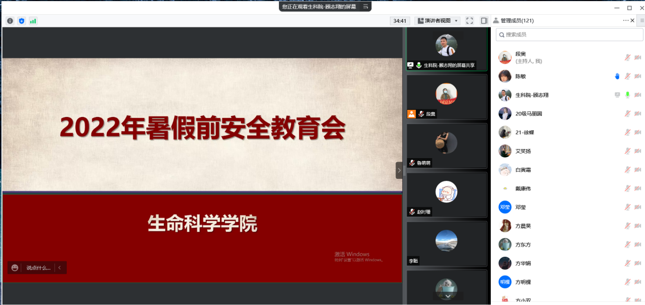 (通讯员:段奥 顾志翔)为做好暑期研究生安全教育管理工作,保障研究生人身财产安全,根据研究生院、研究生工作部相关工作要求,生命科学学院于2022年7月1日召开了2022年研究生暑假前安全教育会议。本次会议由研究生辅导员顾志翔主持,全体在籍研究生参加。