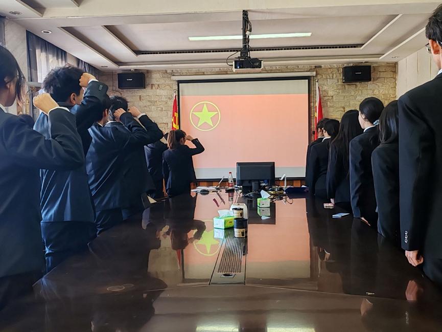 仪式在雄壮激昂的国歌声中开始。主持人宣读了新增团员名单,并由介绍人为其佩戴团徽。接着,全体团员肃立,举起右手,以嘹亮的嗓音、饱满的精神,在鲜艳的团旗前庄严宣誓。随后,丁一可同学宣读了《团章》中有关团员的义务和权利的条款。新团员代表及老团员代表相继发言。