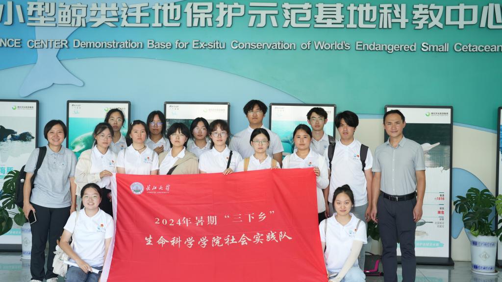 长江江豚是世界上唯一的淡水江豚。它性情活泼,是嘴角含笑的生灵,因此被称为“微笑天使”。7月12日上午11时,实践队赶往石首天鹅洲江豚自然保护区,调研江豚保护情况。实践队员首先观看了江豚保护纪录片,然后参观了江豚科普馆。通过纪录片和讲解员对标本的讲解,实践队员慢慢走近江豚,对江豚的身体结构、生活习性和生态位有了初步的认识。讲解员讲道:“通过保护区上下齐心的努力,江岸在变绿,江水在变清,一度成为濒危物种的江豚如今频频露脸。”听到这里,实践队员们无不心潮澎湃,期待着与“微笑天使”们见上一面。