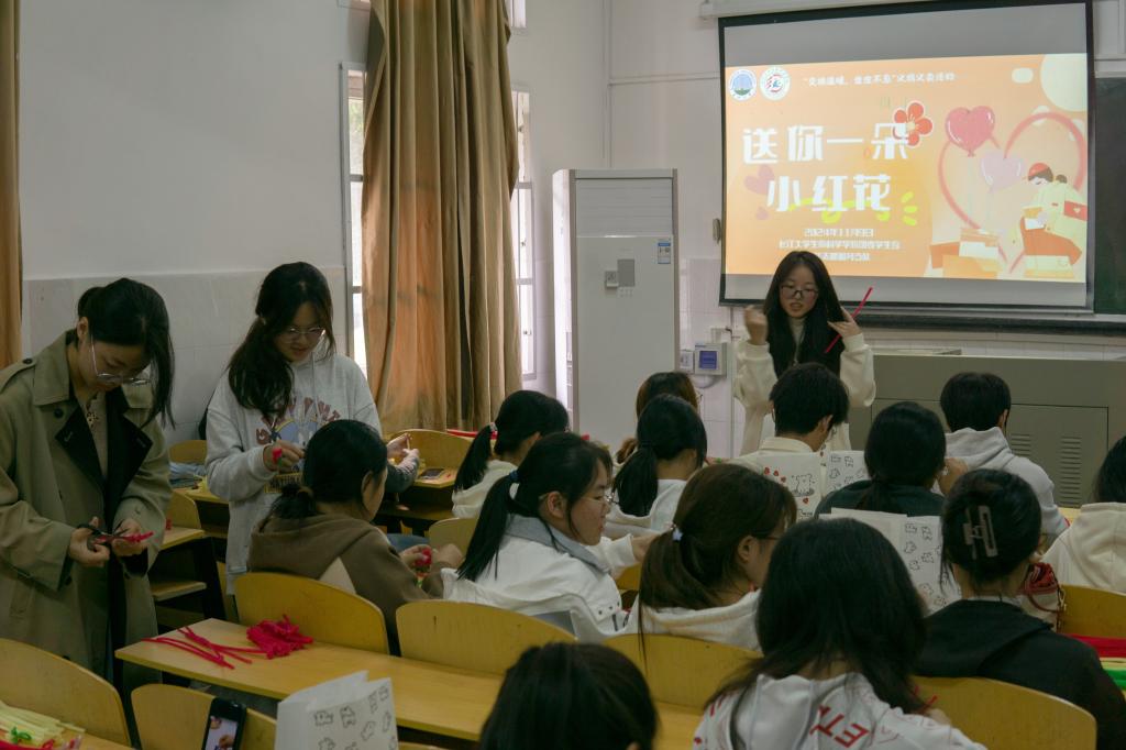 (通讯员 汪芸 孙光伟)红花一朵赠君旁,情意绵绵暖心房。11月9日下午14时许,生命科学学院在2教108室开展了一场别开生面的手工制作志愿活动——“送你一朵小红花”。此次活动由生命科学学院团委学生会青年志愿服务支队承办,共30名志愿者参加,旨在通过手工制作小红花,传递爱心与温情,为义捐义卖活动做准备工作,同时促进学生之间的互动与交流。
