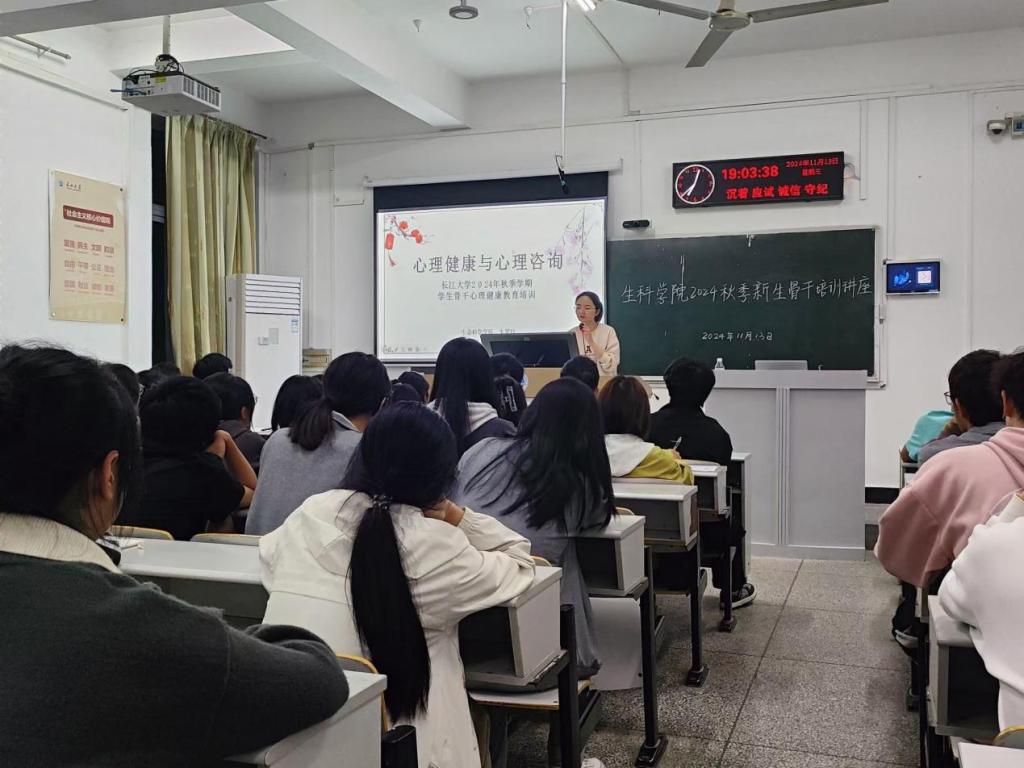 (通讯员 朱翠玲)为进一步提升学生心理健康水平,强化学生心理安全意识,生命科学学院于11月13日晚在西校区7教204室开展秋季学期学生骨干心理健康教育培训。本次培训由心理专干朱翠玲老师主讲,本、研各班级的班长、团支部书记、安全委员、心育委员、寝室长以及学生会心育部人员等120余人。