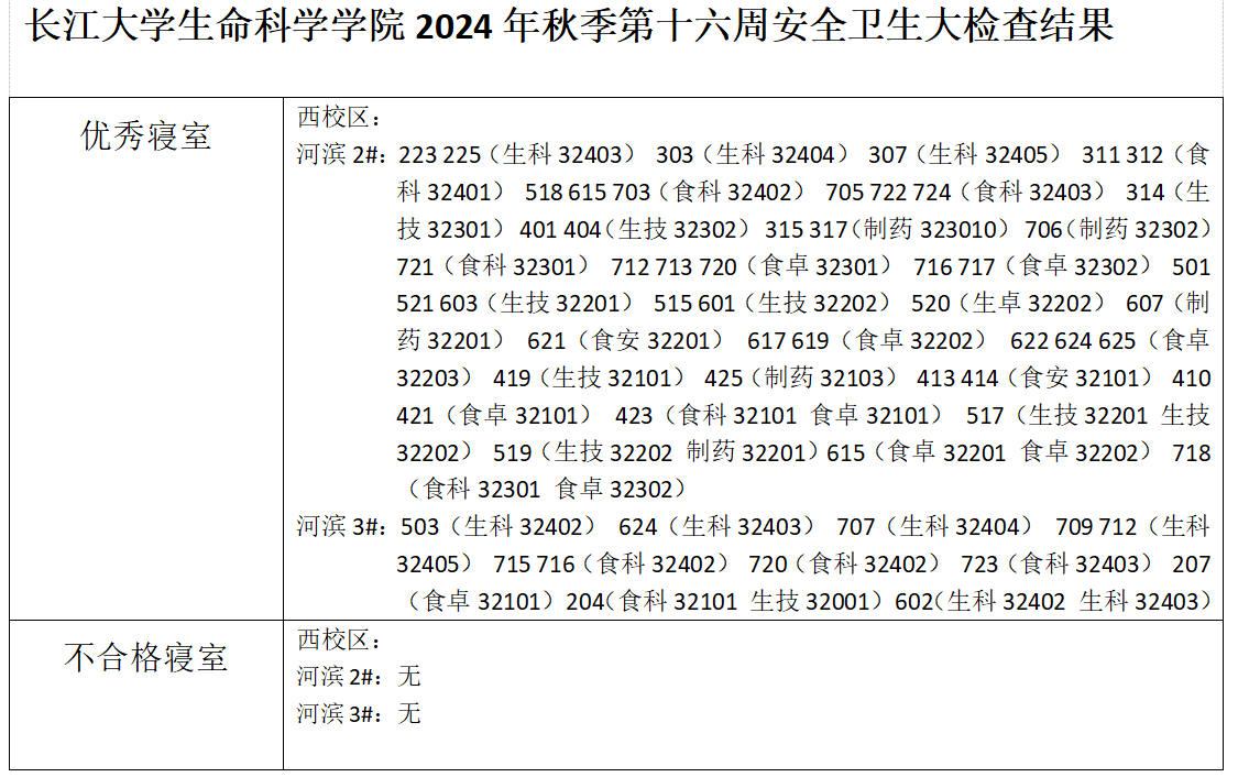 长江大学生命科学学院2024年秋季学期第十六周安全卫生大检查结果