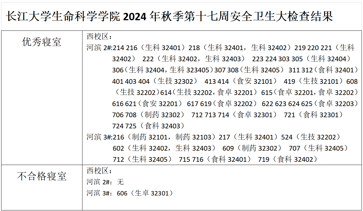 长江大学生命科学学院2024年秋季第十七周安全卫生大检查结果