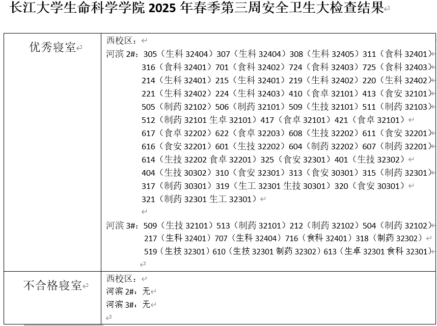 长江大学生命科学学院2025年春季学期第三周卫生大检查结果