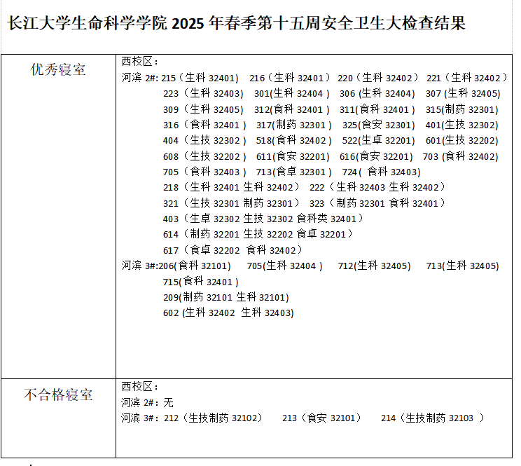 长江大学生命科学学院2025春季学期第十五周安全卫生大检查结果
