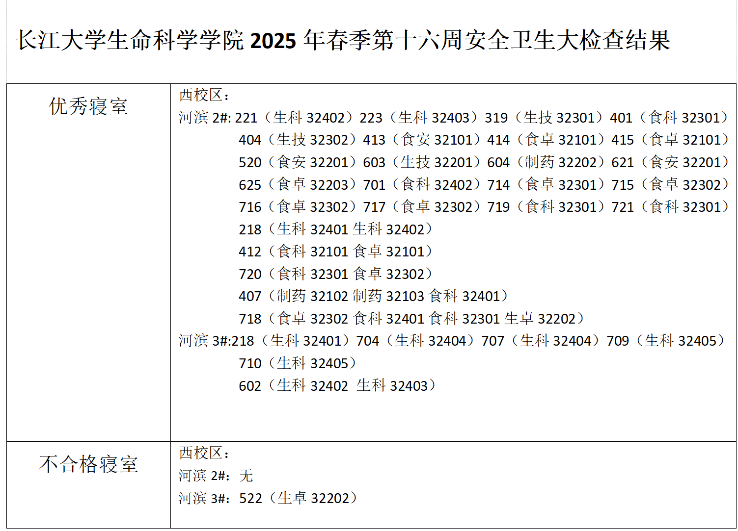 长江大学生命科学学院2025年春季第十六周安全卫生大检查结果