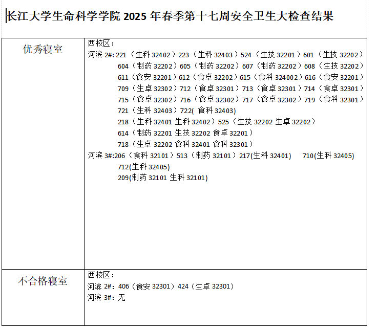长江大学生命科学学院2025春季学期第十七周安全卫生大检查结果