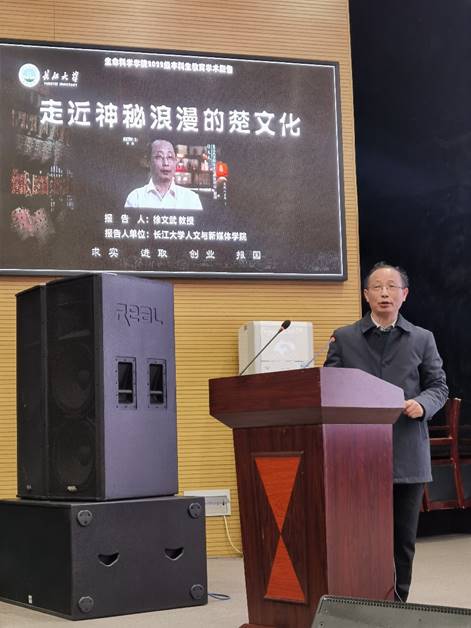 3月16日,生命科学学院邀请人文与新媒体学院徐文武教授,在农科大楼1058报告厅为2022级本科生作了题为《走进神秘浪漫的楚文化》的学术报告。