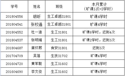 根据课堂考勤结果,累计旷课2学时的,3名同学;累计旷课4学时及以上的(旷课1次=2学时),6名同学;迟到2次及以上的,3名同学。为严肃校风校纪,督促学生按时到课,及时教育违纪学生,根据《长江大学学生违纪处分办法》第十五条、《生命科学学院课堂考勤实施办法》,经学工办研究决定,对本月累计旷课4学时及以上、迟到2次及以上同学予以通报批评: